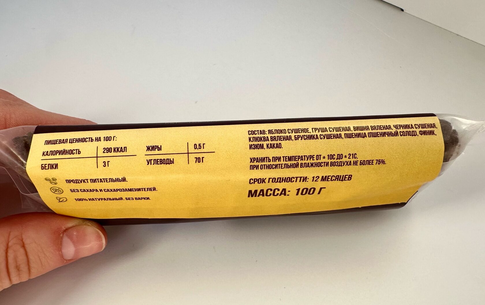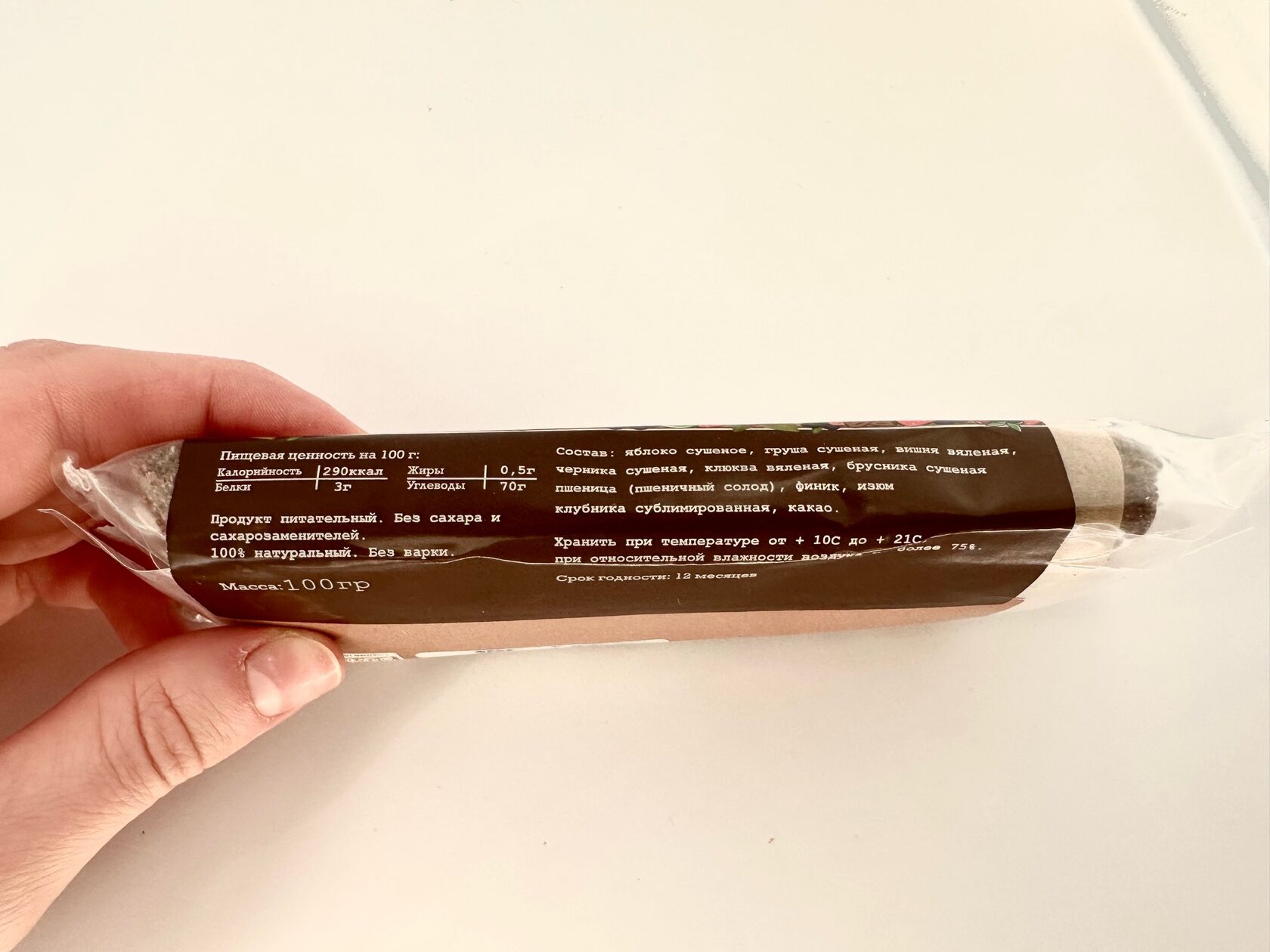 Состав: какао порошок, яблоко, груша, вишня, смородина, стружка кокоса, изюм, финик.